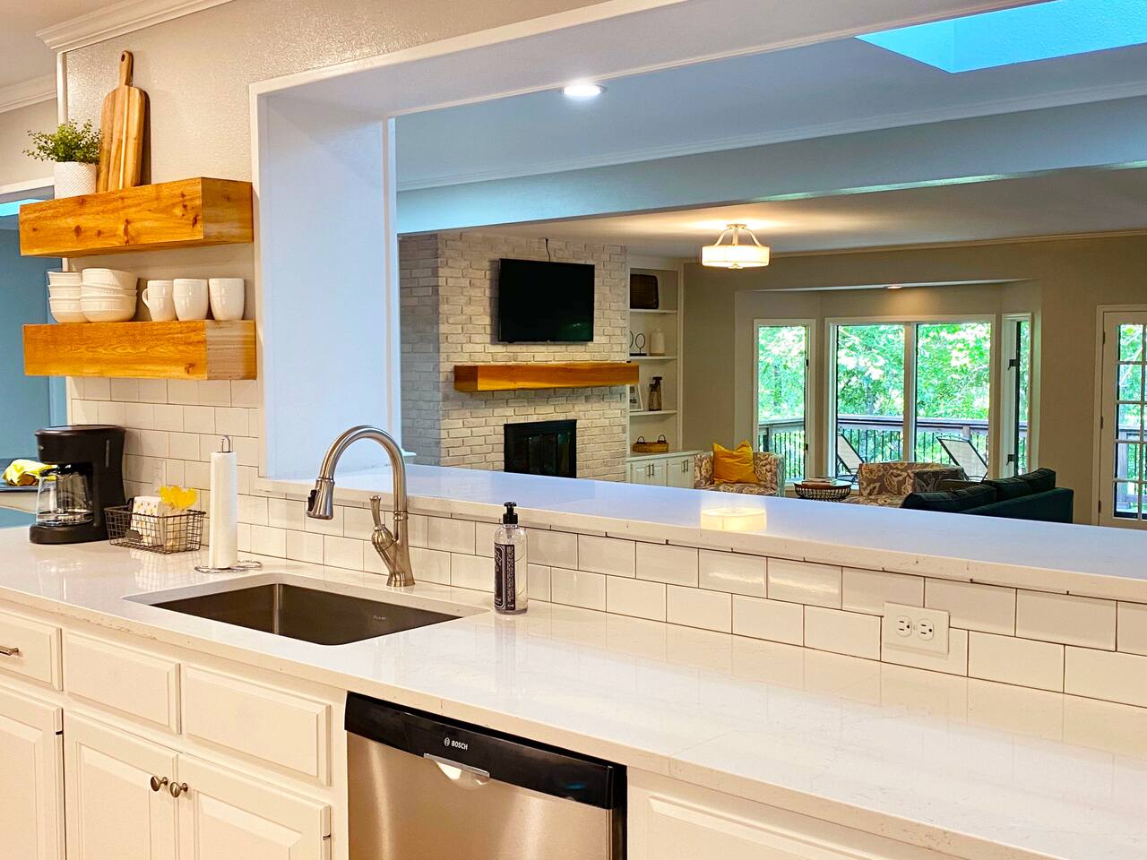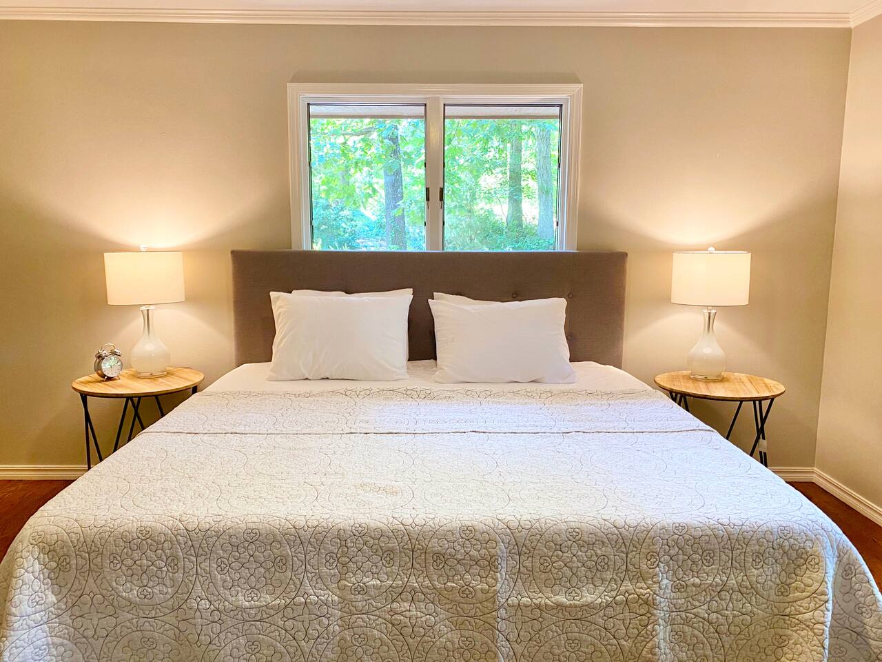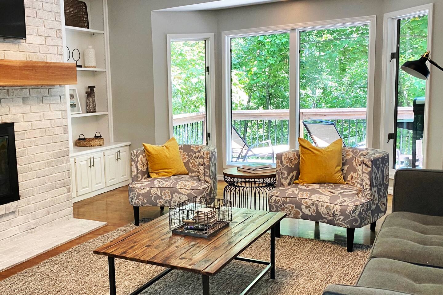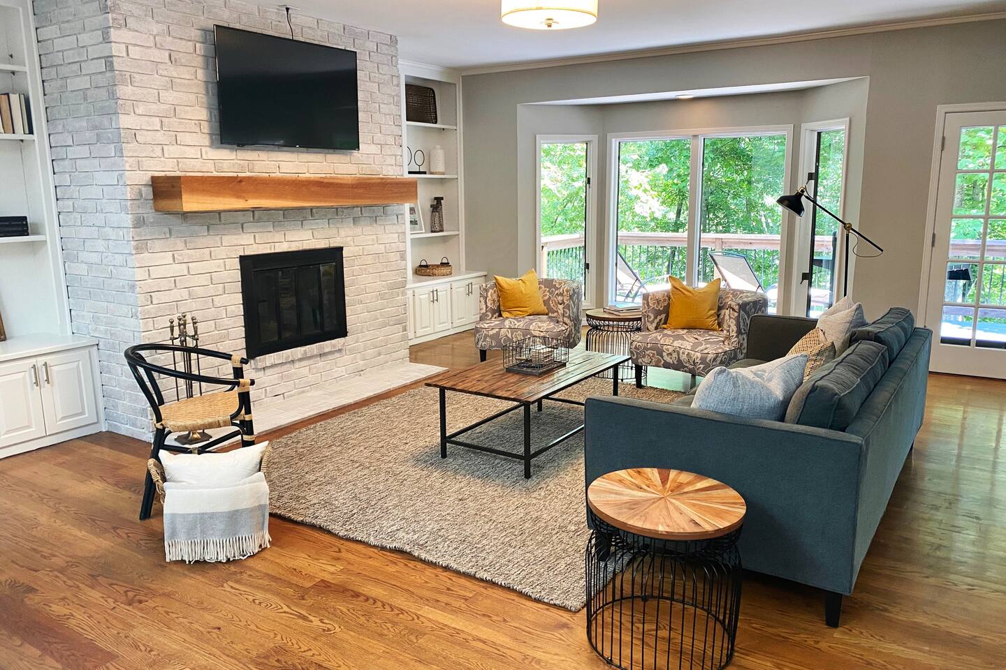 Blue Heron Cove Lakehouse is a spacious, two-story lakefront home designed for groups who want to be together—without feeling on top of one another. With multiple living areas, generous bedrooms, and peaceful lake views from nearly every level, the house offers the perfect balance of gathering space and quiet retreat. The main living area is located on the upper level, where large windows frame views of Lake Avalon and the surrounding trees. This floor features a comfortable living room with a wood-burning fireplace, a fully stocked kitchen and a dining area ideal for shared meals. Two private bedrooms on this level each have their own bathroom, making it a great setup for couples or guests who prefer fewer stairs. Step out onto the upper deck to enjoy coffee in the morning or sunset views over the water. Downstairs, a second living room with another wood-burning fireplace creates a relaxed space for kids, games, or movie nights. This level includes three additional bedrooms, a full bathroom, and a separate laundry room with washer and dryer. One of the bedrooms is accessed through another bedroom, which works especially well for families or kids sharing space. From the lower level, guests can step out onto a covered patio that opens to the backyard and the wooded path leading toward the lake. Throughout the home, there are multiple places to gather—two living rooms, decks on both levels, and outdoor seating—so larger groups can spread out comfortably. The layout is especially well-suited for multi-generational families, reunions, or group trips where everyone appreciates both shared time and personal space. Just below the house, a scenic path leads to your private dock on a quiet cove of Lake Avalon with peaceful water access for kayaking, fishing, and swimming, along with a true sense of lakeside seclusion. Please note the fireplaces are available for guest use from October through March.